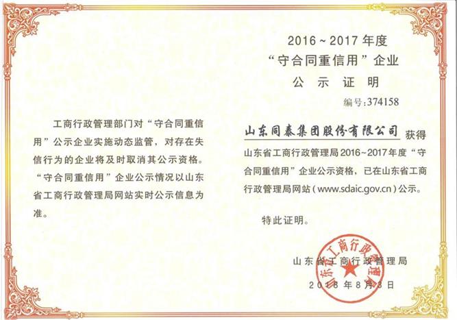 “山東省工商局“守合同重信用”公示資格